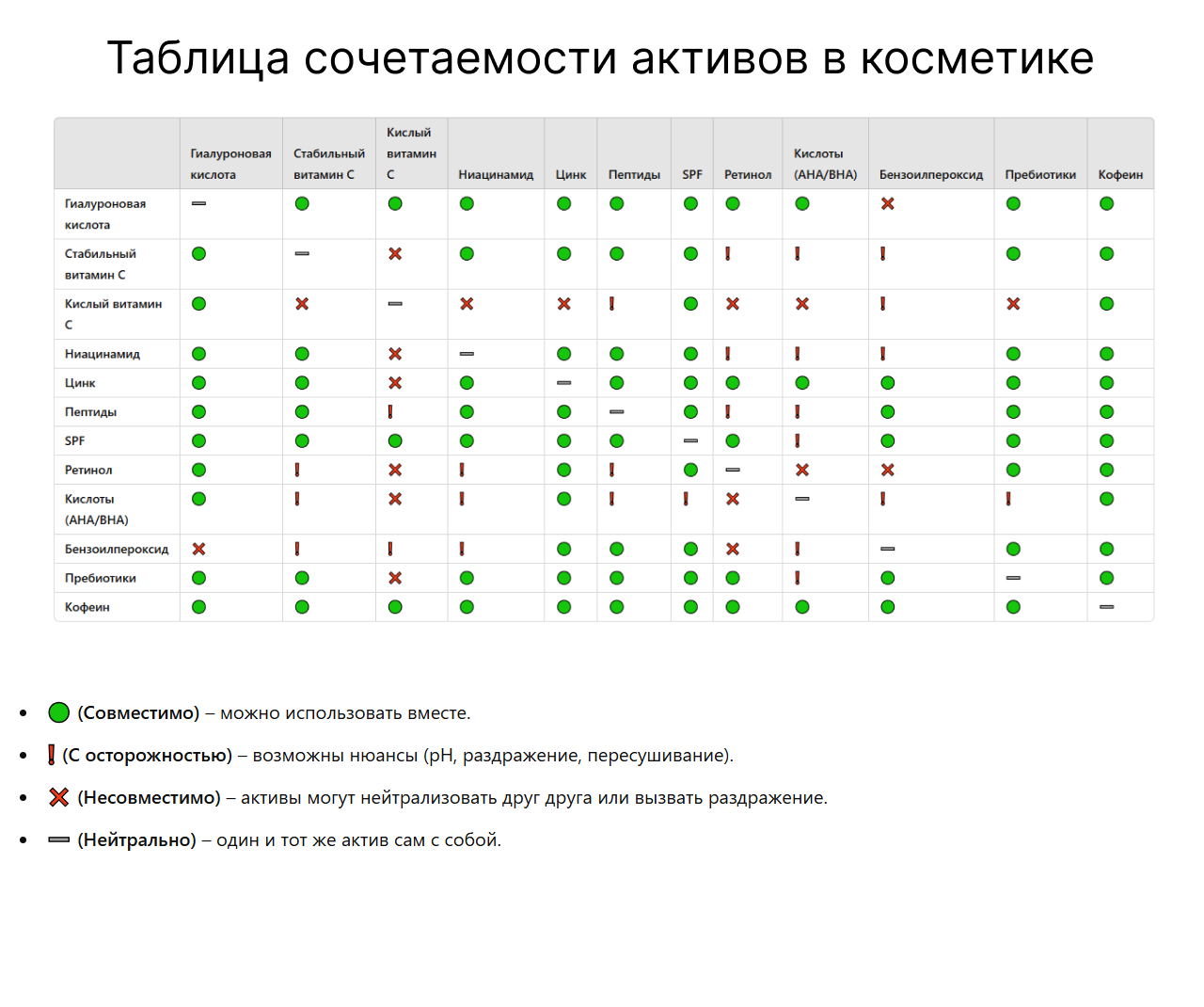 🚫 L-Аскорбиновая кислота + ниацинамид — нестабильное сочетание, которое может снижать эффективность обоих компонентов.